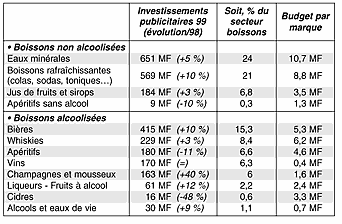 En 1999, le marché publicitaire du secteur des boissons représente 3,2 % du marché publicitaire total. Il a connu une croissance de 6 %, soit une augmentation de ses investissements publicitaires de 196 millions de francs (2 714 MF en 1999 contre 2 518 MF en 1998). Le secteur des boissons alcoolisées (48 % du secteur boissons) progresse de 6 %, alors que celui des boissons non alcoolisées (52 % du secteur boissons) enregistre une hausse de 7 %. Avec environ 0,45 MF, le budget moyen par marque du secteur vins tranquilles est le plus faible du secteur boissons. Sans doute ce constat doit-il être lié au moindre degré de concentration du secteur viticole, ainsi probablement qu’à la faible rentabilité des entreprises de ce secteur. Source : Onivins-Infos - n° 80 janvier 2001. |