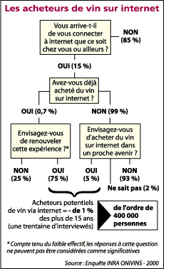Une partie du questionnaire concernait l’achat de vin sur Internet. Le diagramme ci-contre reprend l’intitulé des questions, leur enchaînement et les résultats obtenus.À l’époque du sondage, 15 % des Français âgés de 15 ans et plus déclaraient se connecter à Internet, chez eux ou ailleurs. Parmi ces internautes, moins de 1 % a déclaré avoir déjà acheté du vin via Internet, ce qui représente 4 personnes dans l’échantillon constitué pour cette enquête. Parmi les internautes qui ont déclaré ne jamais avoir acheté de vin par le net, 93 % ont déclaré ne pas envisager d’en acheter par ce moyen dans un avenir proche, 2 % sont restés indécis et seuls 5 % ont déclaré envisager prochainement un achat de vin via Internet. On peut ainsi estimer, qu’au printemps 2000, les acheteurs potentiels de vin sur Internet représentaient environ 1 % de la population française âgée de 15 ans et plus ; soit moins de 500 000 personnes. Au niveau de l’échantillon constitué pour l’enquête, ces acheteurs potentiels représentent un peu plus d’une trentaine d’individus, ce qui ne permet pas d’en dresser un portrait robot. Source : Onivins Infos - n° 83, mai 2001. |