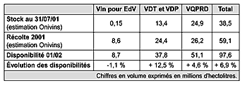 Selon les prévisions Onivins au 31 juillet 2001, les disponibilités prévisionnelles de début de campagne 2001/2002 sont celles répertoriées dans le tableau ci-contre. A noter que les chiffres de 97,6 M/hl est à modérer d'un décalage dans les dates de références. Campagne 2000/2001 est estimé au 31/07/01 (nouvelle OCM) et non plus au 31/8 comme précédemment. Le chiffre de 97,6 moins l'activité supposé du mois d'août s'établirait à 92,8 M/hl soit supérieur de 5,3 M/hl à la moyenne quinquennale. |